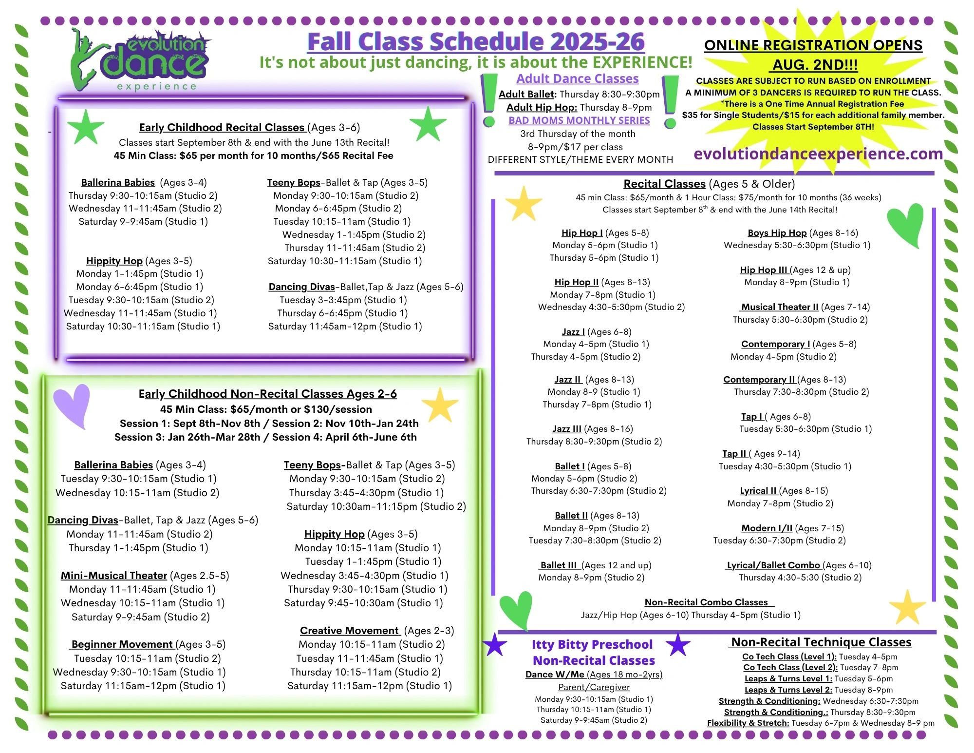 At Evolution Dance Experience, dancers learn a number of important life lessons; the dynamics of building confidence within themselves, discipline through hard work, and how to persevere & overcome future challenges. These are all lessons they can carry with them throughout their lives!